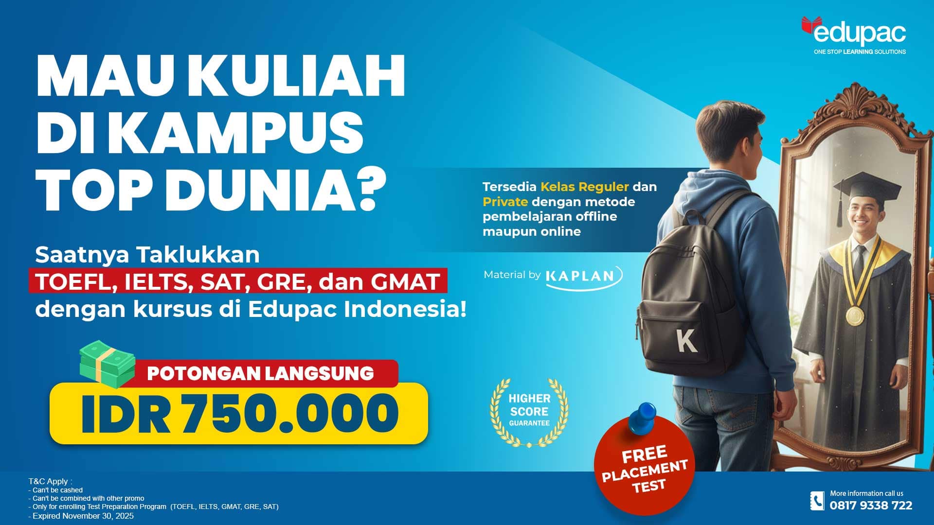 Dapatkan potongan langsung Rp 750.000 untuk kelas persiapan tes seperti TOEFL iBT, IELTS, GMAT, GRE dan SAT. Klaim Promonya SEKARANG! (Free Placement Test & Consultation). Ada CASHBACK juga up to IDR 1.500.000 lagi jika kamu bisa mencapai nilai yang tinggi setelah kursus di Edupac Indonesia. (Khusus kelas TOEFL iBT dan IELTS). Jika Kamu daftar berdua dengan teman Kamu atau orang terdekat Kamu lainnya, Maka Kamu akan dapat tambahan potongan sebesar Rp 500.000 jika orang yang Kamu ajak daftar sudah memulai kelasnya.